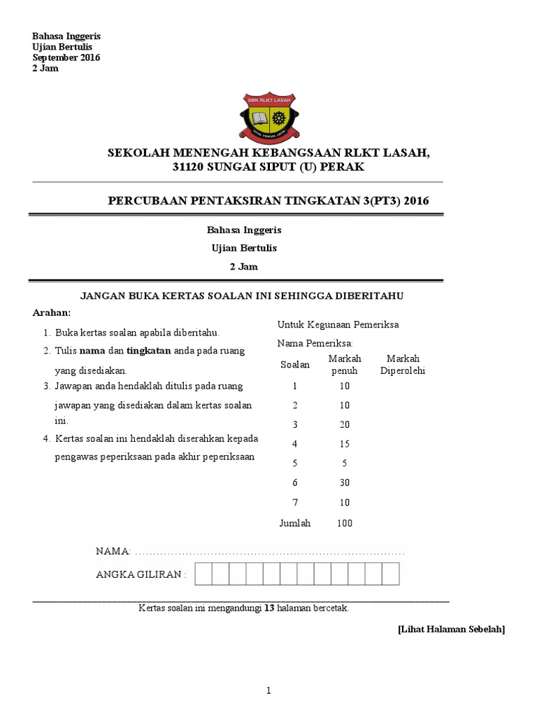 Semoga Perkongsian Soalan-Soalan Peperiksaan Percubaan PT3 Pentaksiran Tingkatan 3 panduan bahan rujukan sumber rujukan dalam post di blog Bumi Gemilang berguna dan dapat. Instrumen Contoh Bahasa Inggeris. Percubaan SPM Bahasa Melayu MRSM 2016.
